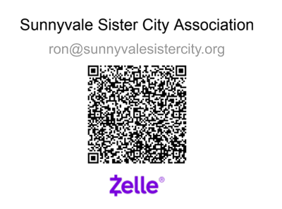 You can sponsor SSCA by using Zelle through your bank's mobile app on your phone. In the app, go to the designated Zelle section and simply enter ron@sunnyvalesistercity.org as the recipient or scan the QR code below.